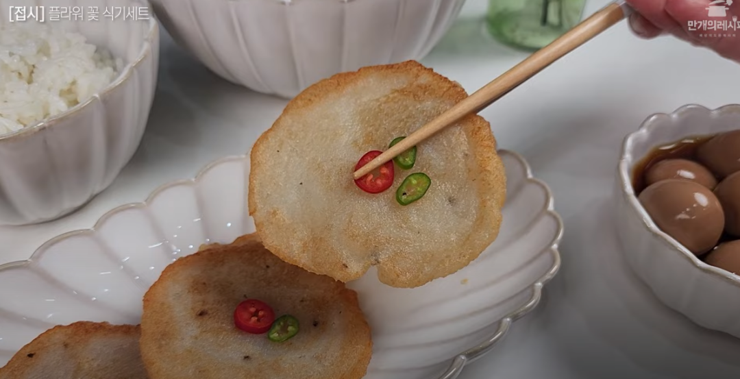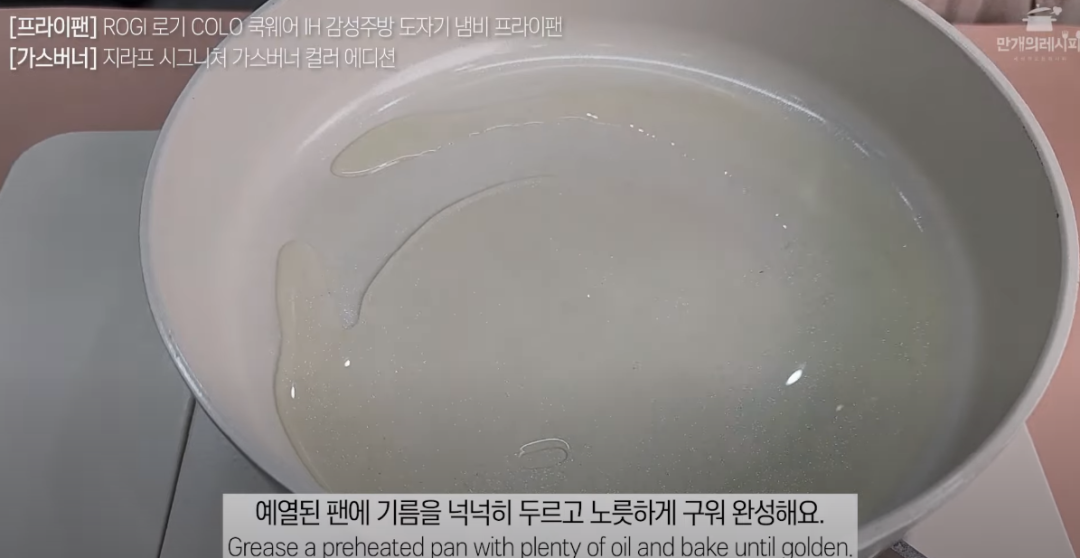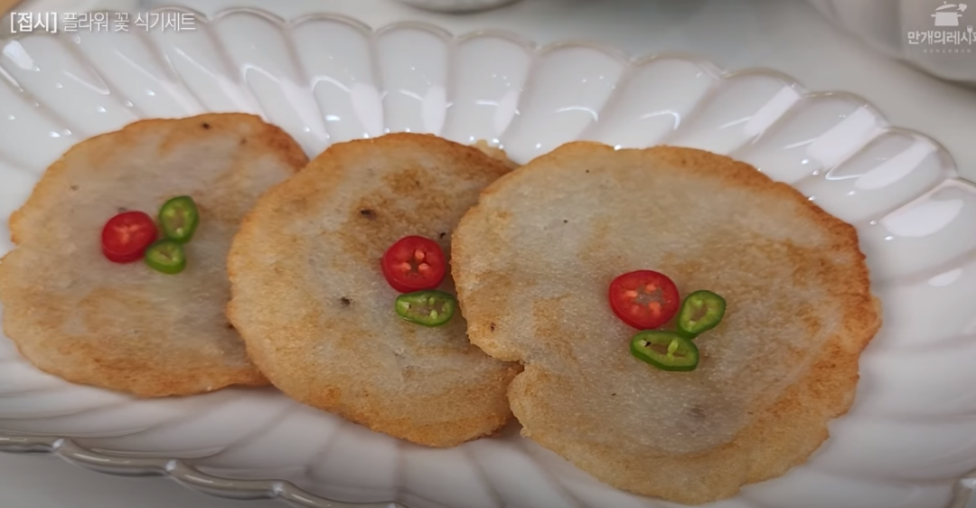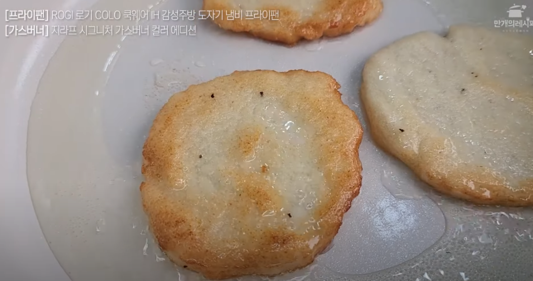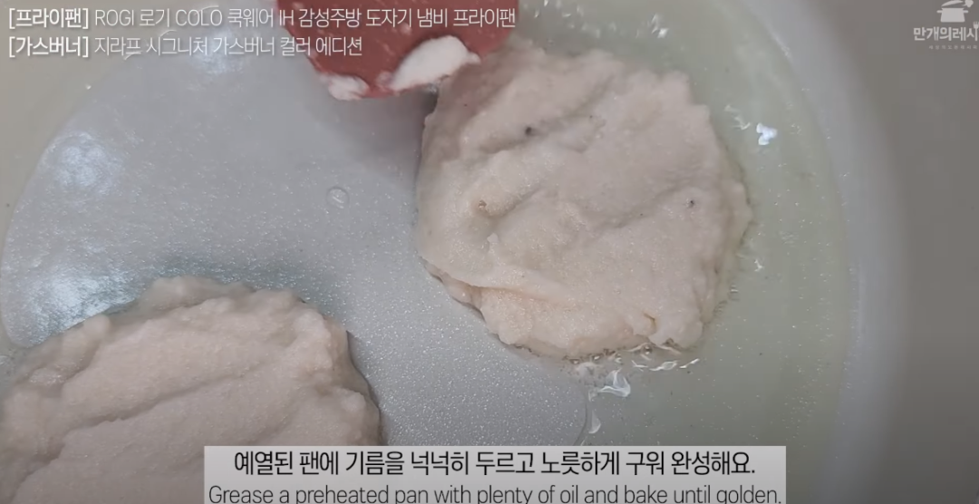 7. 锅里倒油,舀上一勺面糊放入锅里,煎熟一面后翻面煎另一面,两面煎成金黄色即可(可以撒上适量辣椒圈做点缀)