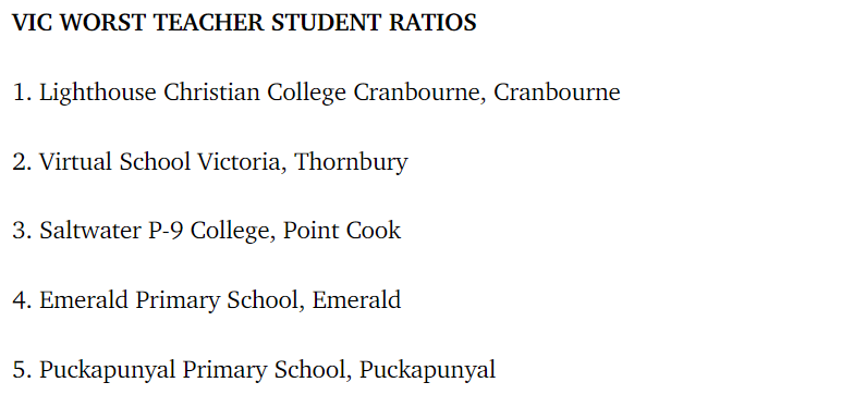 最差师生比的维州学校如下所示: