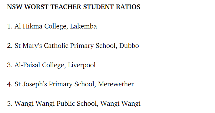 比如在新州偏远地区,师生比最高的五所小学中有四所是天主教小学。