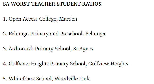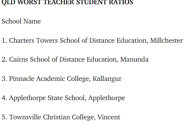 表现最好的大中型学校由位于布里斯班 Kelvin Grove 的Queensland Academy for Creative Industries,比例为 8.4:1。