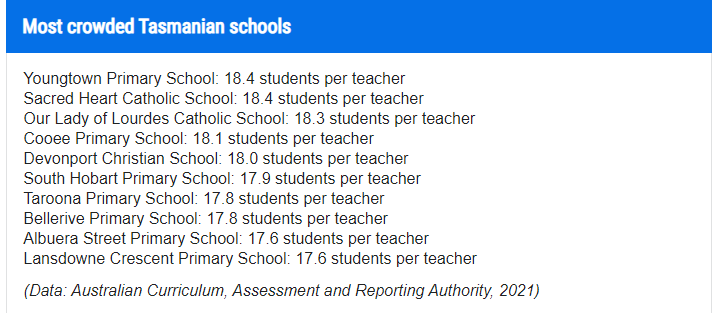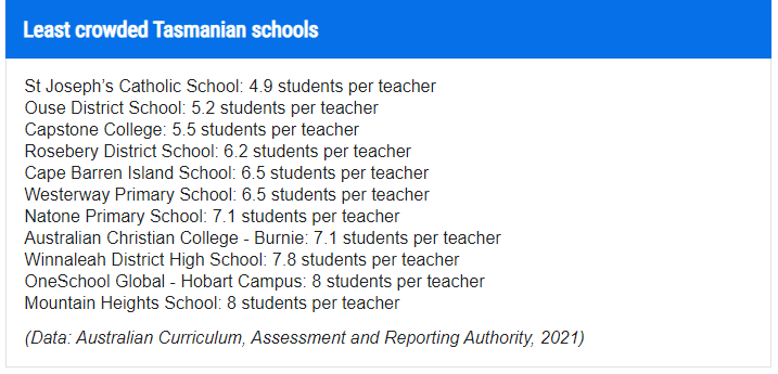 根据 ACARA 的数据,2021 年全国师生比为每位教师 13.3 名学生——但塔州 53% 的学校的师生比为 13.4 或更高,小学是 14.5:1,中学是 11.9:1。