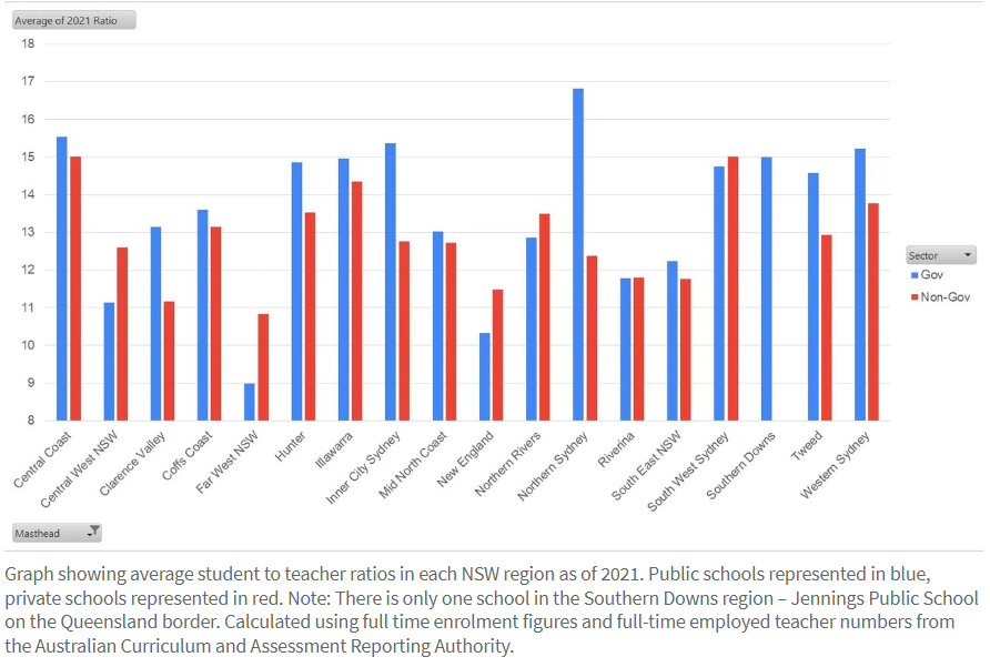 悉尼北区的公立学校与天主教和独立学校相比,每名教师平均多带四个学生。该地区公立学校学生与老师的比例为 16.8:1,而非公立学校的比例为 12.4:1。