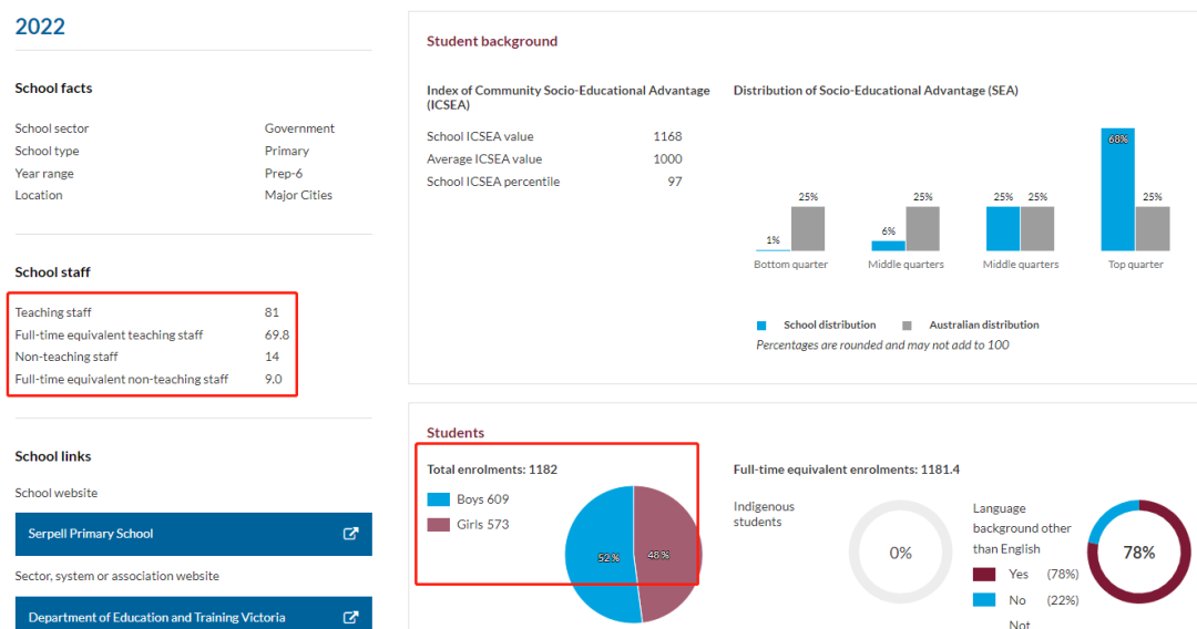 比如根据2022年NAPLAN 5年级进行排名,获得维州小学排名第6、公立小学排名第一的学校Serpell Primary School,想要获得这所学校师生数据,只需要在My School官网搜索一下就可以出来: