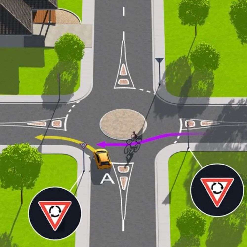 这里的黄色汽车正在左转进入环形交叉路口,而一名骑自行车的人正在直行。