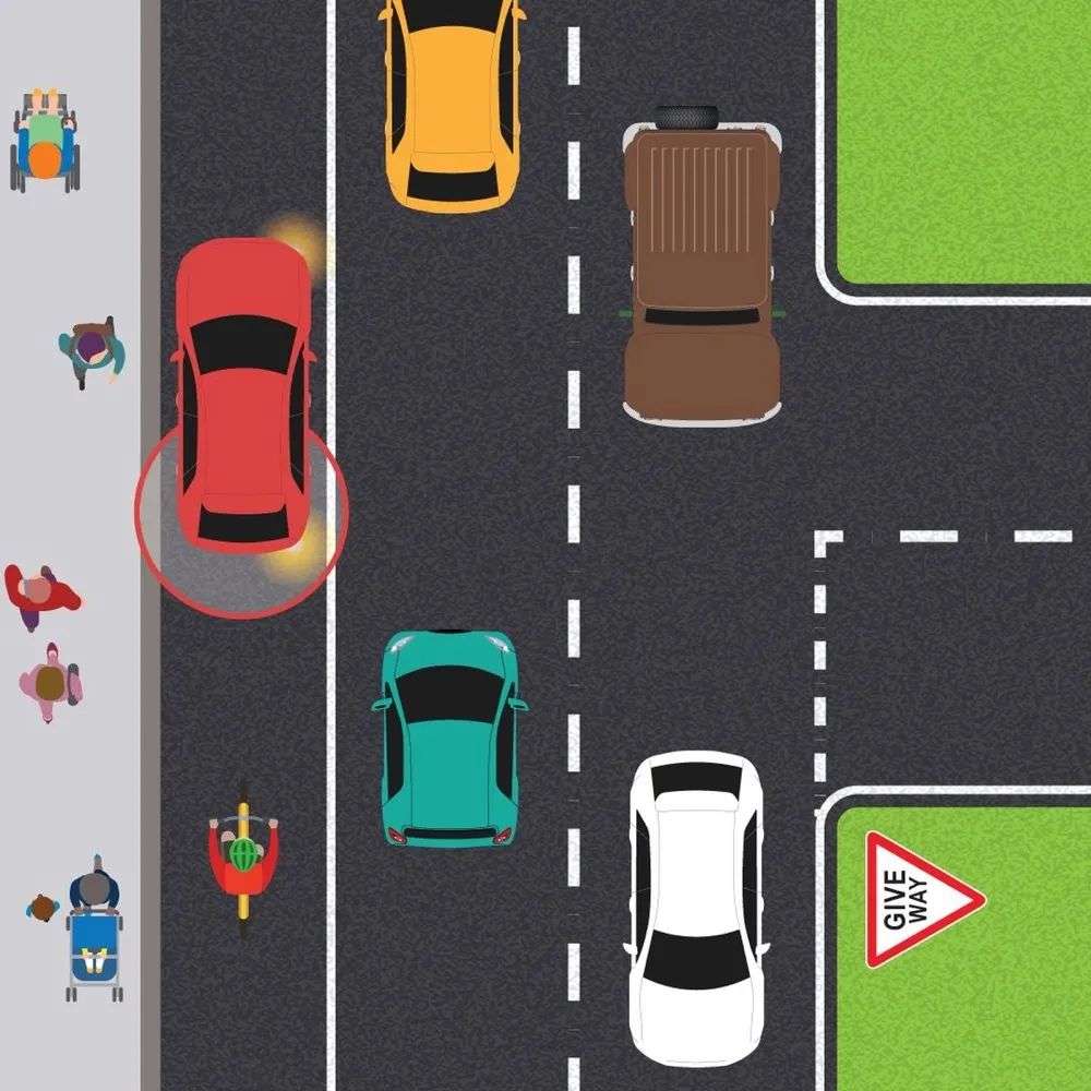 在上图中,红色汽车需要给哪些车辆让路?