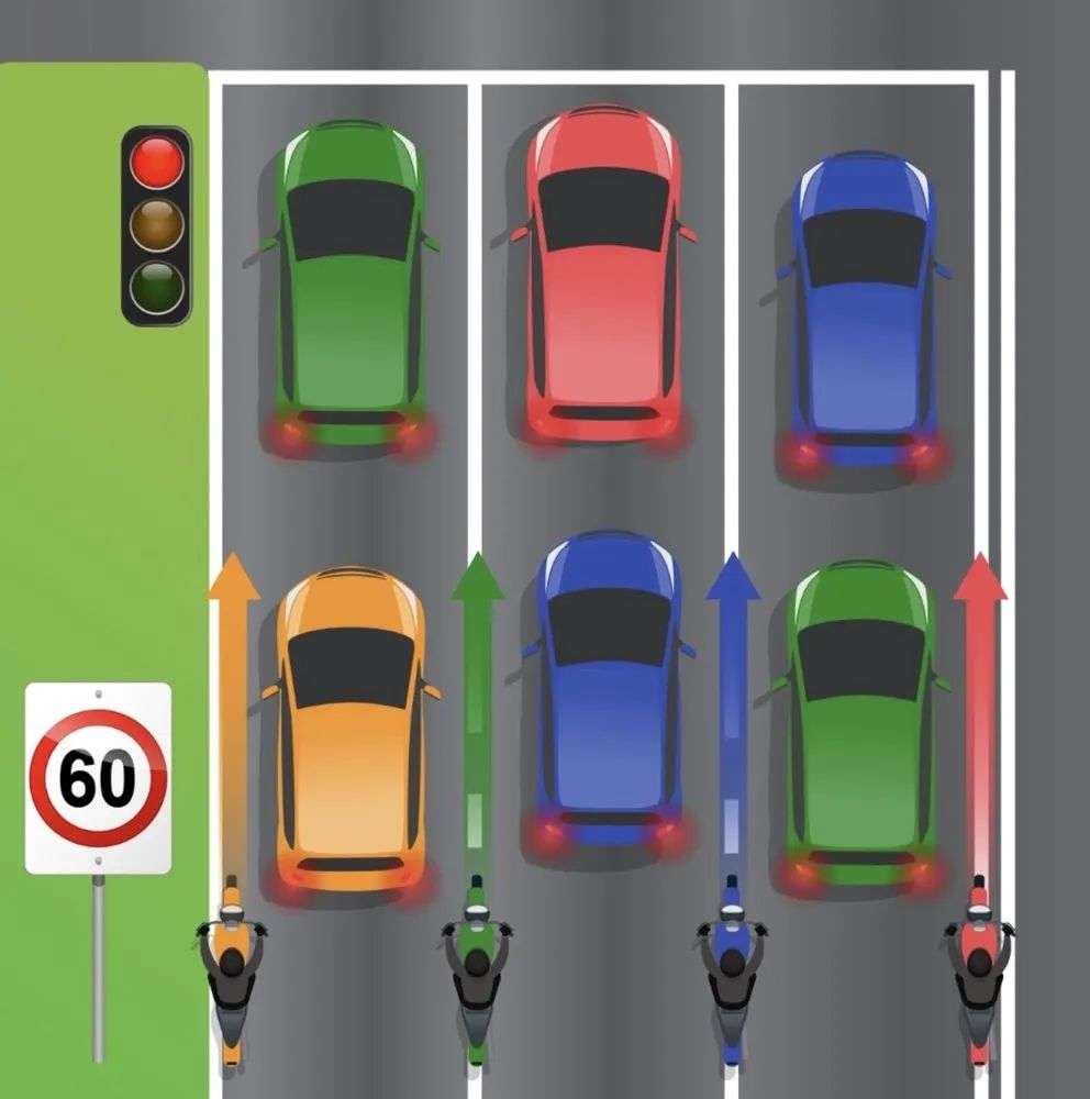 为确保行人的安全,摩托车钻车缝时仅允许在静止或缓慢移动的车辆之间进行,任何时候都不允许在车辆和路边之间驾驶。