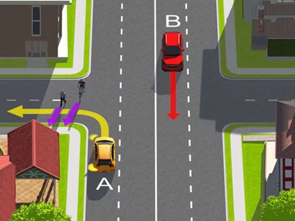 行人和骑自行车的人正在横穿车辆A转入的道路,答案是车辆A必须让路。