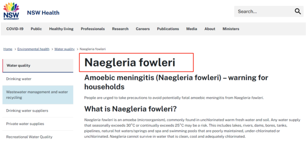 “福氏耐格里虫是一种变形虫(微生物),常见于未氯化的温暖淡水和土壤中。任何季节性超过30°C或一直超过25°C的供水都可能存在风险。”