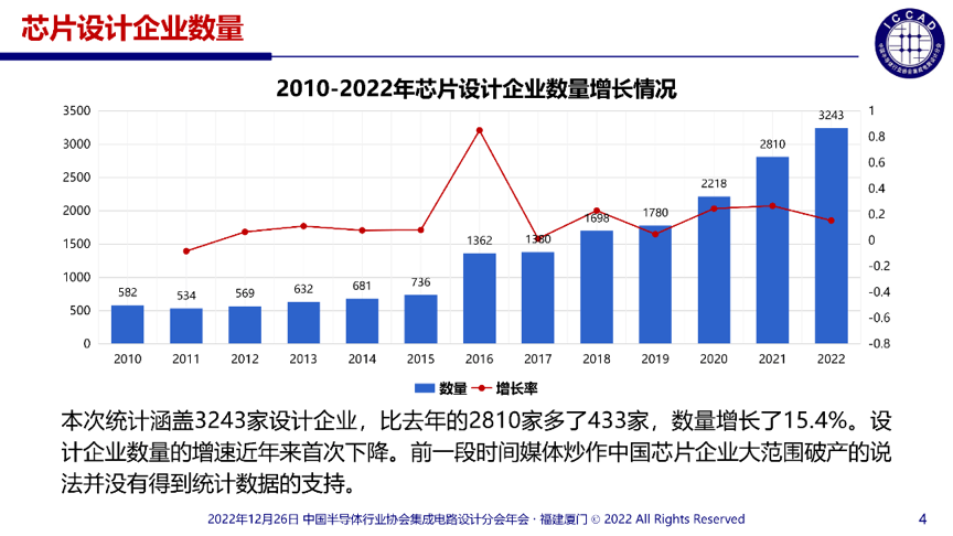 根据中国半导体行业协会集成电路设计分会统计数据,2022年,国内芯片设计企业数量由2021年的2810家增至3243家,增加了433家,数量增长了15.4%;全行业销售预计为5345.7亿元,同比增长16.5%;2022年能够进入十大IC设计企业的门槛从2021年的66亿元提升到了70亿元,预计有566家企业的销售规模超过1亿元,较2021年的413家增加135家。