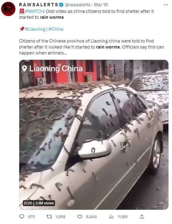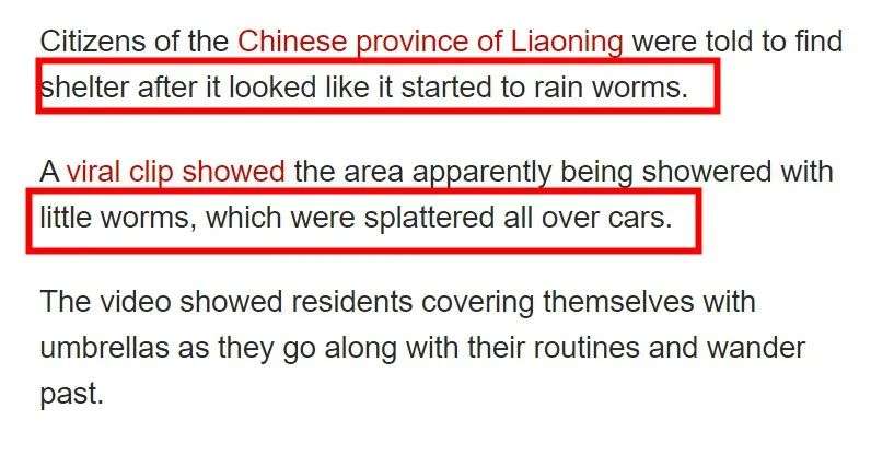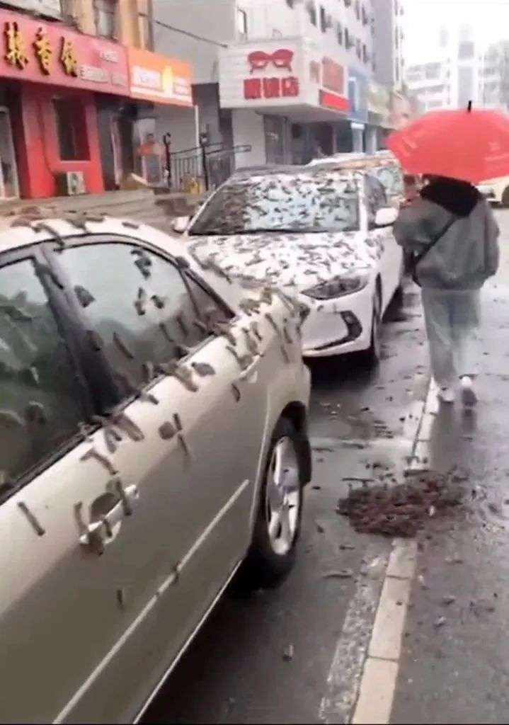 “一段在中国拍摄的视频在网络疯传,该地区布满了小虫子,这些虫子散落在汽车各处。中国辽宁省的市民被告知需要找到避难所,市民们只能用雨伞遮住自己。”