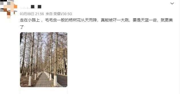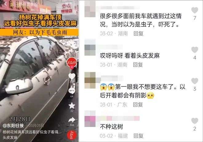 视频拍摄当天正巧下雨,又因为影片中的杨树花密集的让人不适,真的宛如在下毛毛虫雨。当时确实引起了网友的疯狂转发。