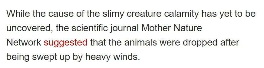 “虽然黏糊糊的生物灾难的原因尚未揭开,但科学杂志《Mother Nature Network》表示,这类事件一般发生在暴风雨后,这些虫子被强风卷走后,形成了虫雨。气温骤降会导致小动物昏迷,然后从树上掉落,但并不会死亡,随著气温上升它们会再次苏醒。”