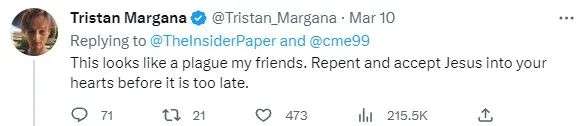 “我的朋友们,这看起来像一场瘟疫。在一切变得更糟糕之前悔改,并让耶稣进入你的心中吧!”