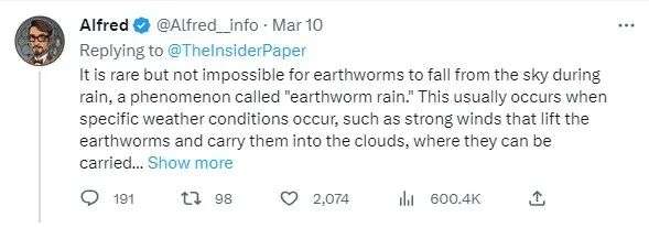 “蚯蚓在下雨时从天而降的情况很少见,但并非不可能,这种现象称为“蚯蚓雨”。这通常发生在特定的天气条件发生时,例如强风将蚯蚓举起并带入云层,在那里它们可以被带到很远的地方,然后随着雨水落回地面。”