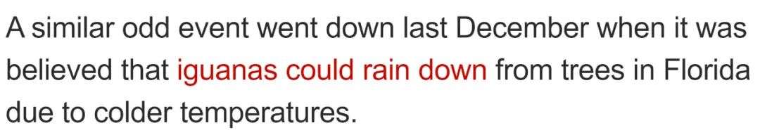 “佛罗里达州去年12月发生了类似的奇怪事件,当时人们认为由于气温较低,鬣蜥可能会像下雨一样从的树上掉下来。”