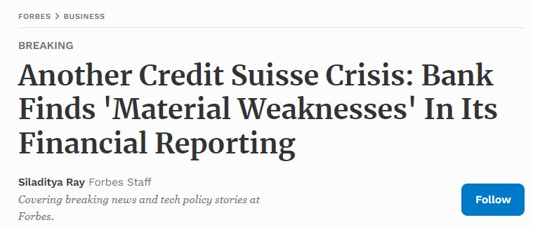 今天早上,更大的危机露出了冰山一角——据《福布斯新闻》报道,瑞士瑞信银行(又称瑞士信贷)财报中存在重大缺陷。