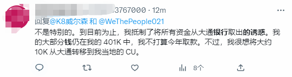 还有网友说,他的大部分钱仍在退休金计划当中,但他的确考虑从摩根大通转移到当地的信用合作社。
