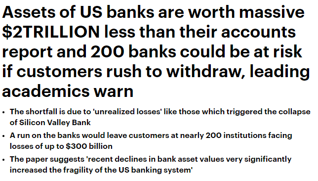 该研究指出,由于引发硅谷银行倒闭的“未实现损失”,美国银行系统持有的资产价值比其账户中显示的少了惊人的2万亿美元。