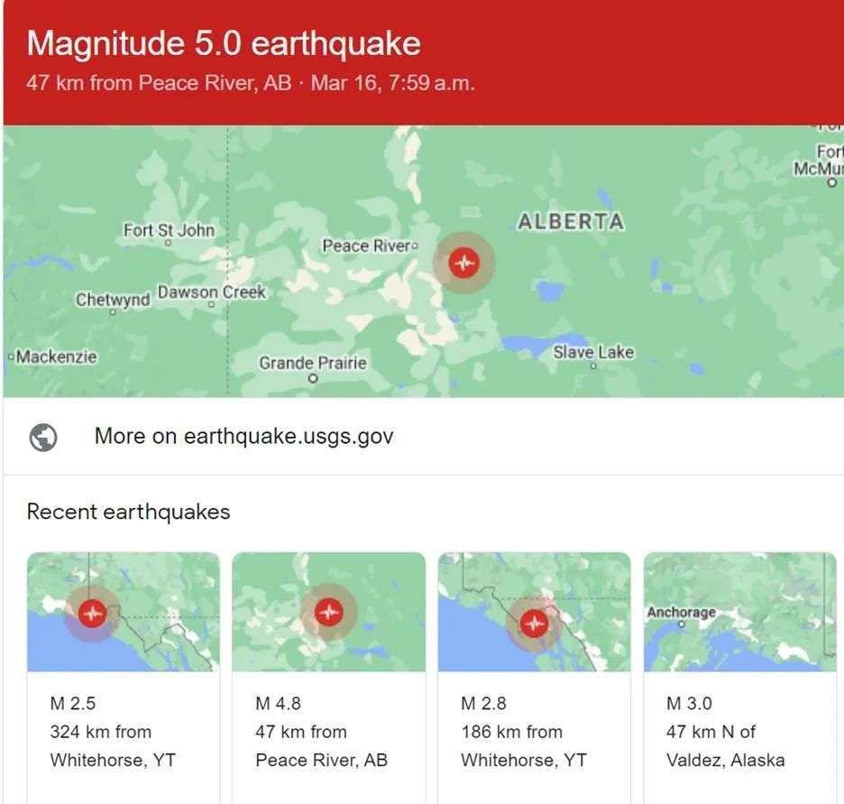 16日:阿省距离peace river和平河约47公里的地段发生规模5级的地震;