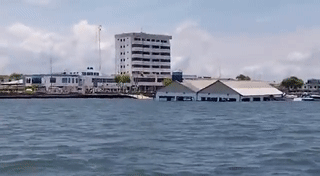 在海边,一个码头在地震中坍塌,建筑物坠入大海,直接被海水吞没。