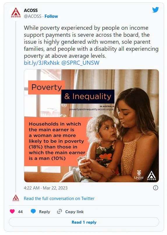 澳大利亚社会服务委员会 (Australian Council of Social Services,缩写ACOSS) 与新南威尔士大学合作,研究哪些群体在其一生中面临贫困风险。