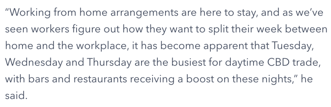 权威人士James Lockwood认为这个趋势将会在今年延续,而由于不少公司安排周五在家办公,让周四成为了全新意义上周末的开始,CBD变得更加繁忙。