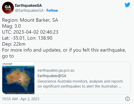 地震始于4月2号凌晨2点46分,当地时间周日下午12点15分左右,Mount Barker和Adelaide Hills的郊区有震感。