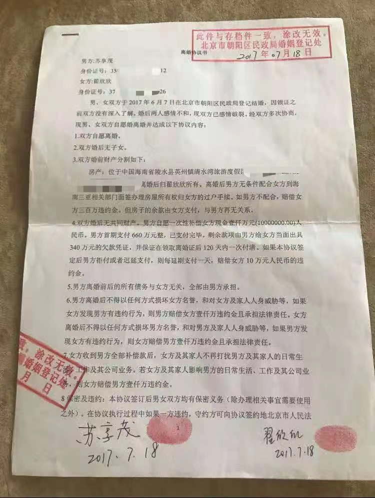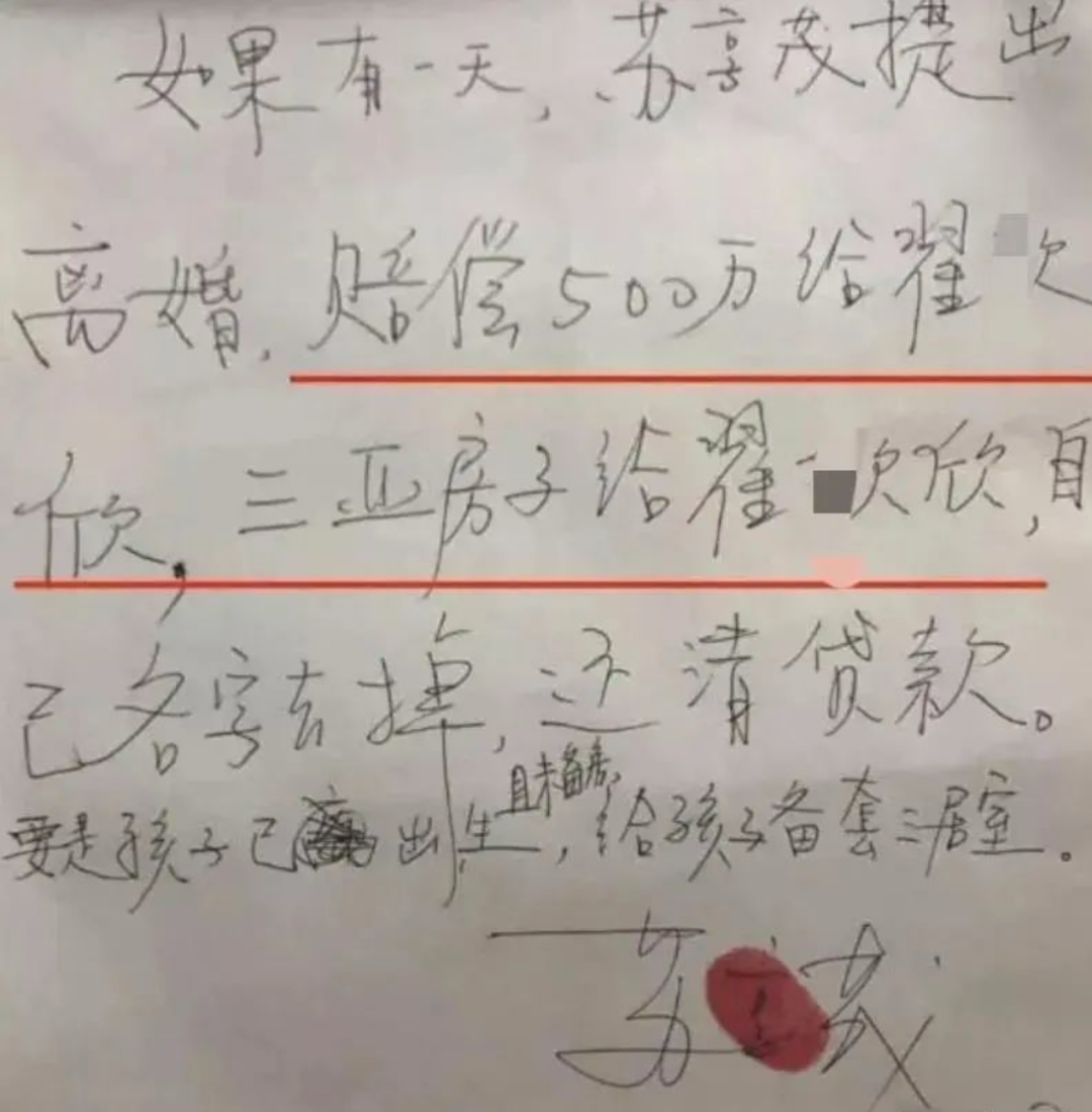 “如果有一天,苏某提出离婚,赔偿500万给翟某,三亚房子给翟某,自己名字去掉,还清贷款。”