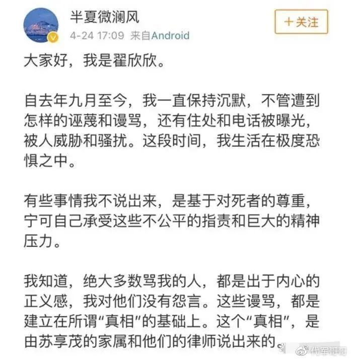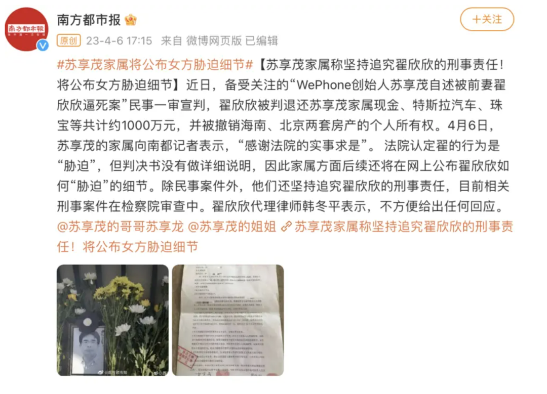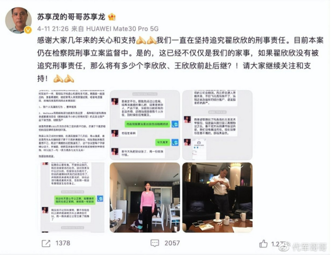 但随即这条Po文遭到苏某家属的驳斥,苏某的哥哥在微博中贴出微信聊天记录等相关证据。