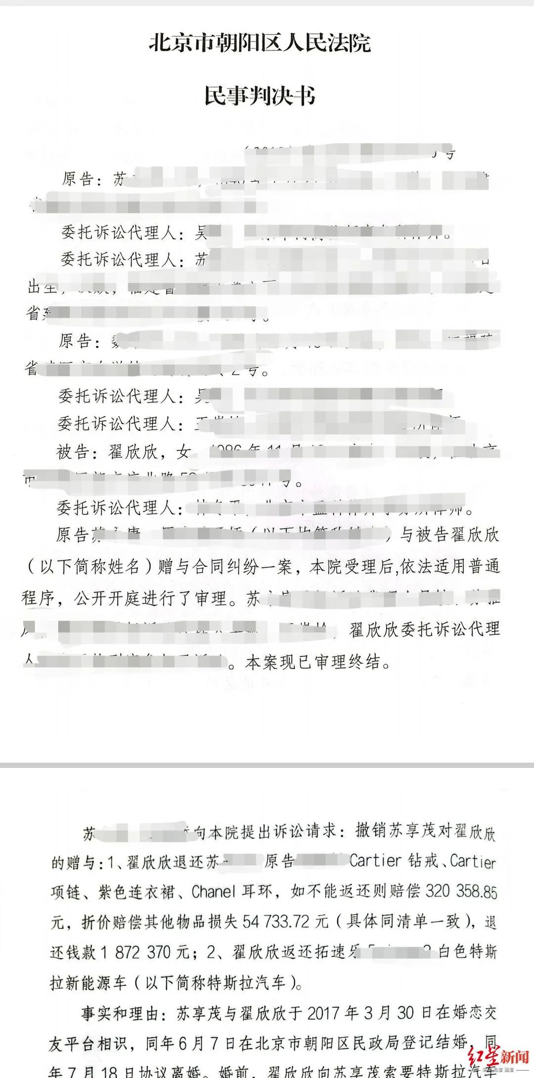 法院判决,翟某须退还苏某家属现金、汽车共近千万以及撤销翟欣欣海南、北京两套房产的个人所有权。