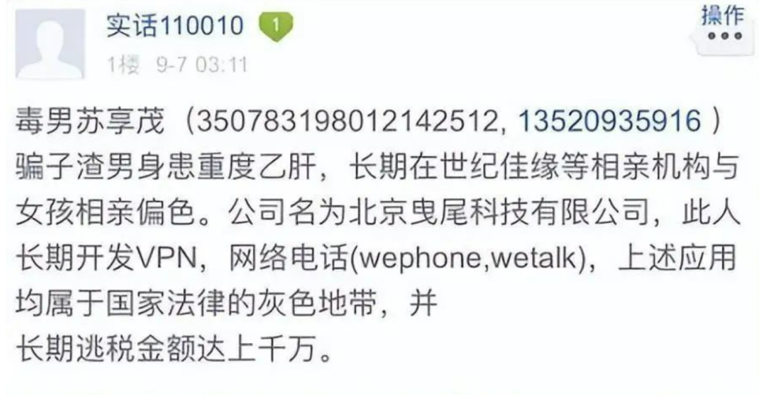 她称苏某患有乙肝,并家暴自己,“长期在世纪佳缘等相亲机构与女孩相亲骗色”。
