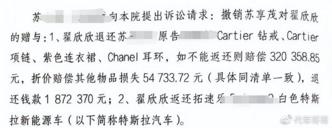 一审判决翟某退还苏享茂家属现金、特斯拉汽车、珠宝等共计约1000万元,