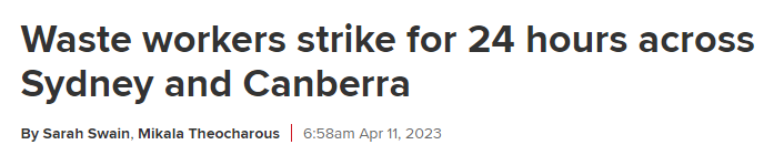 据澳洲九号台4月11日报道,悉尼和堪培拉的一些居民可能会注意到他们的垃圾桶今天早上仍然是满的,因为垃圾处理工人再次举行罢工,要求改善工作条件。