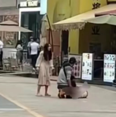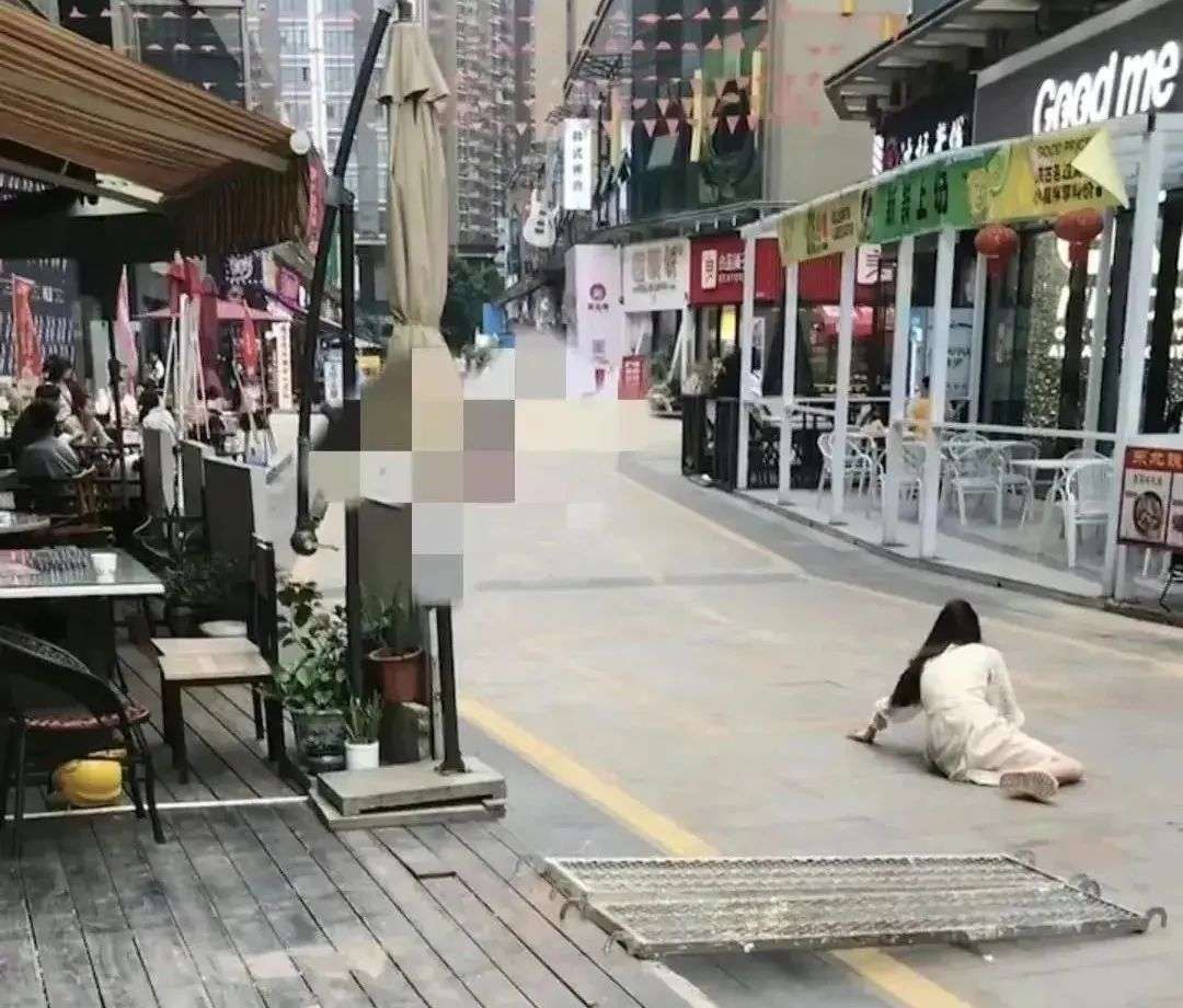 几十米外,一名倒在地上的长发女子正竭力呼喊,疑似劝男子住手。