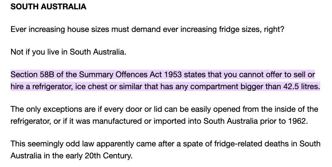 澳洲很鼓励二手商品的买卖,不论是汽车、家电还是其他物品。但是在南澳,根据1953年指定的一条法律规定:出售容量超过42.5升的冰箱属于违法行为。唯一例外的是,如果冰箱是在1962年以前制造的,则可以无视这一法律...