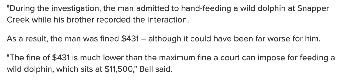 高级野生动物官员蒂娜·鲍尔(Tina Ball)说,肇事者已经承认喂食了海豚,但没有意识到这样做是犯罪。肇事者已经收到处罚通知书,其中一名男子被罚款431澳元。如果需要上庭的话,法庭判处最高罚金可能高达1.1万澳元。