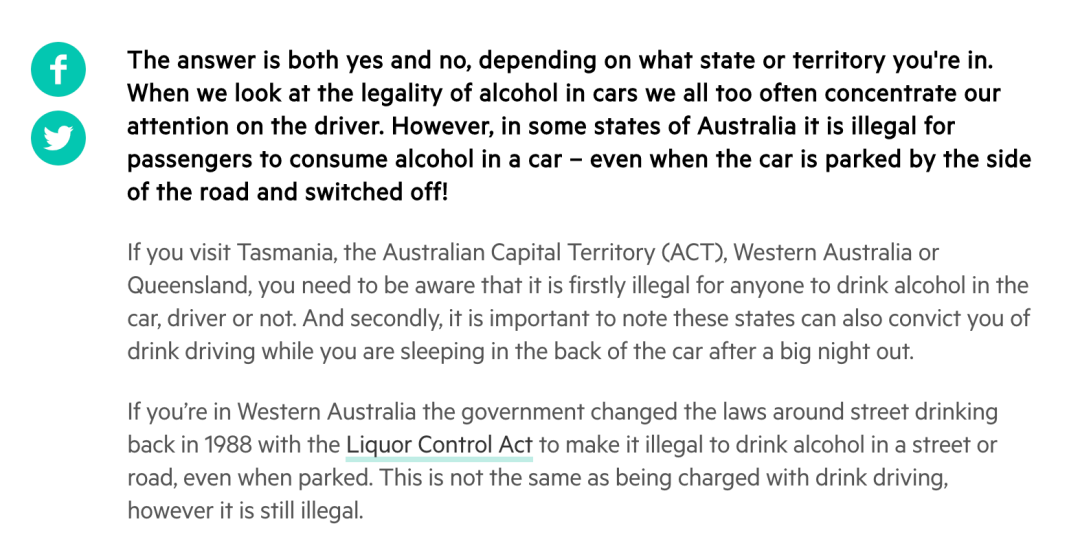 虽然在澳洲,酒驾是违法的,但类似的规定是否适用于乘客?在首都领地、塔州和昆州,在行驶中的汽车上,如果出现任何开封的酒类都属于违法行为,不论是属于司机还是乘客的。