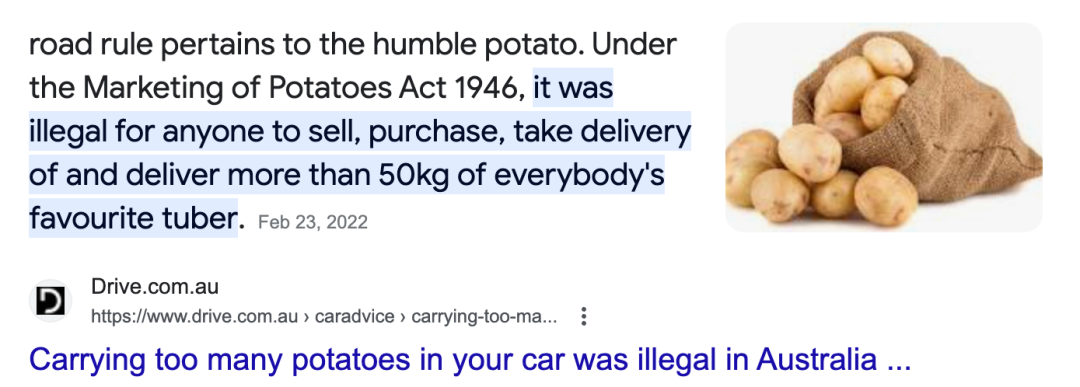虽然这一条看起来很荒唐,但是这条规定确实存在,而且从1946年便开始了。根据这条规定,西澳马铃薯营销机构(Potato Marketing Corporation)有权拦下任何一辆可能载有50公斤以上马铃薯的交通工具,然后例行检查。