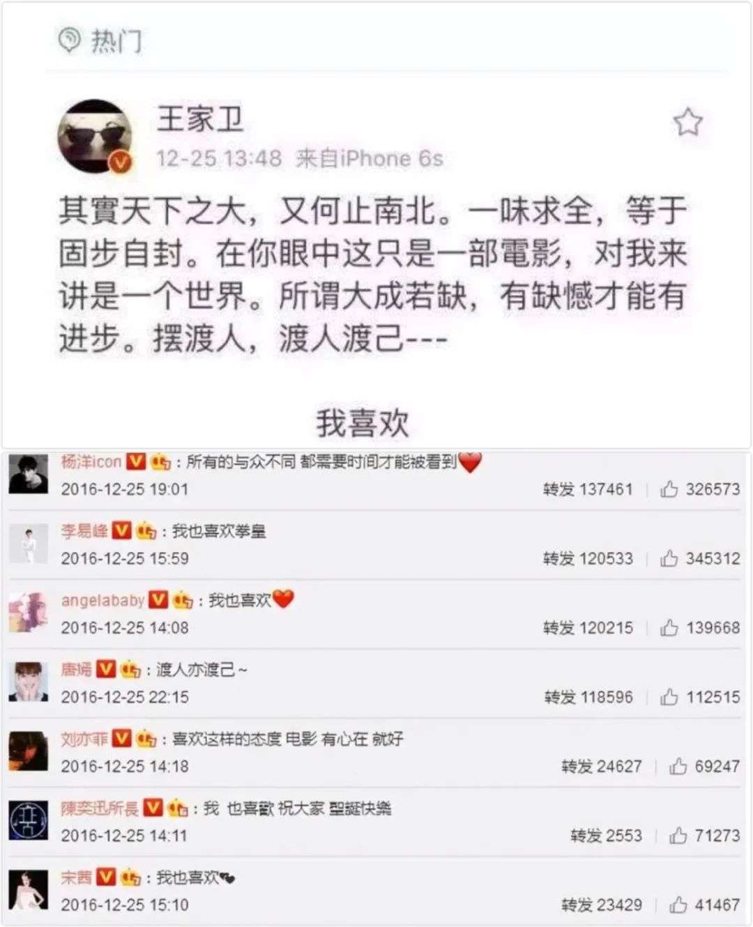 当王家卫在微博上旗帜鲜明地表达“我喜欢”,大半个娱乐圈都赶来转发这条微博,排着队跟着喊“我喜欢”。