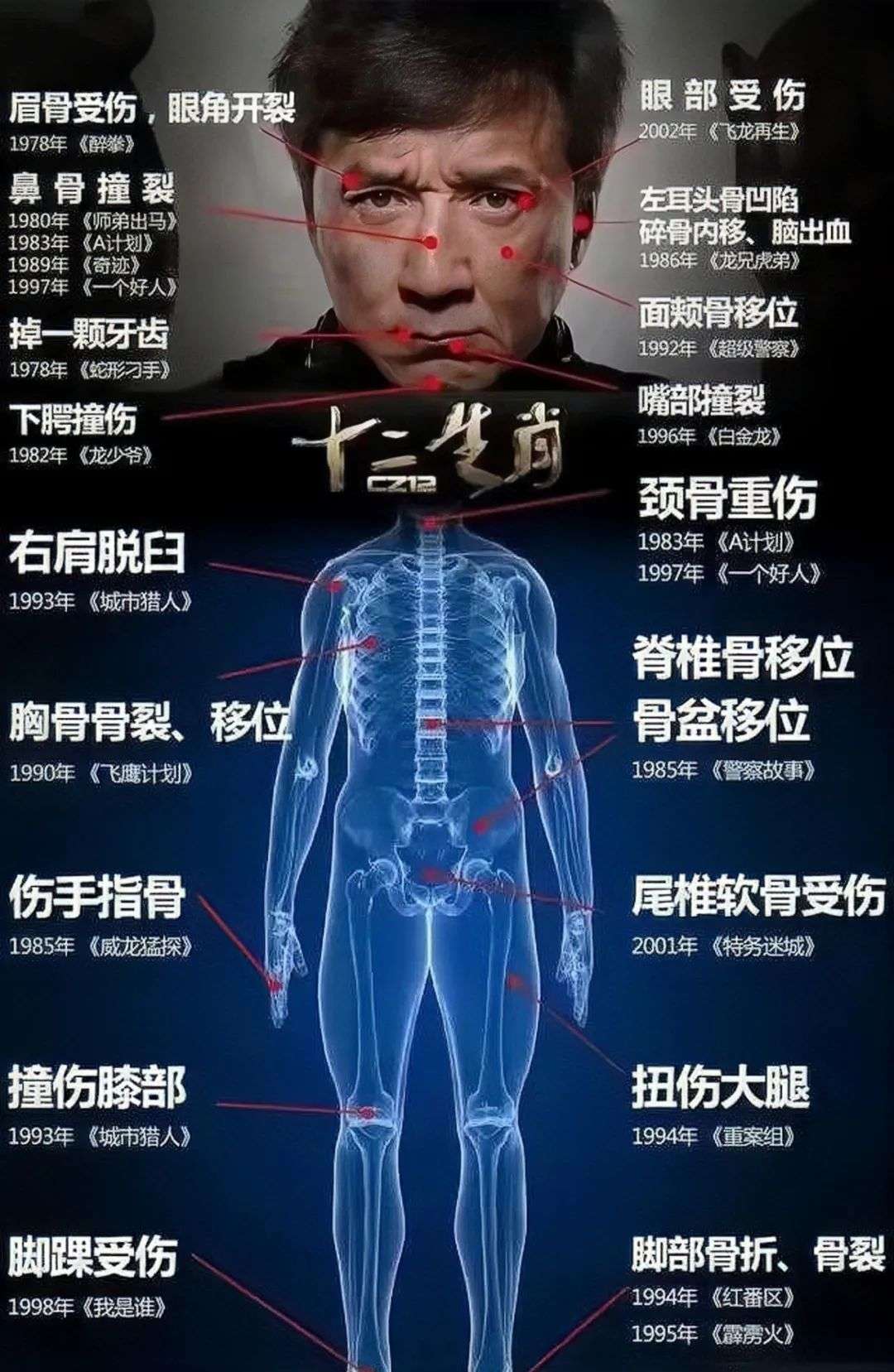 有影迷曾作图统计过他身上的重伤,有档可查的大伤、重伤就有二十余处。