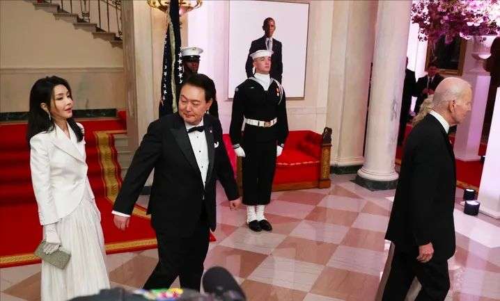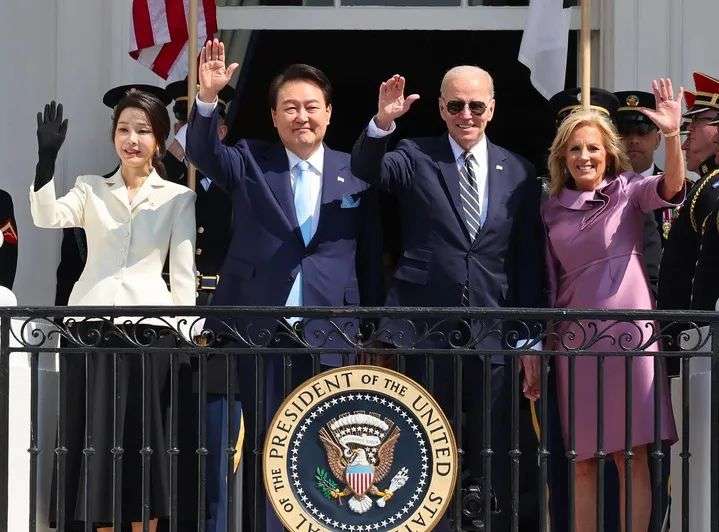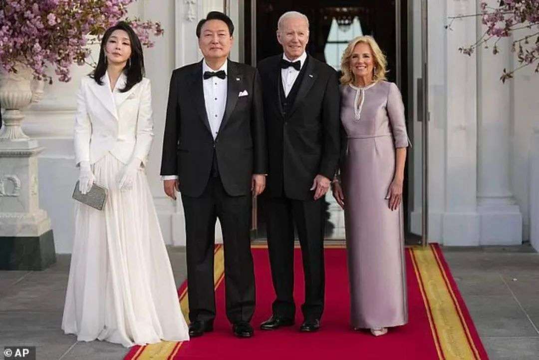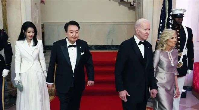 韩国总统尹锡悦访问美国,26日美国总统拜登为其准备在白宫举办国宴。当晚,尹锡悦夫妇在白宫北侧门廊同拜登夫妇互相问候并合影,尹锡悦和拜登均以西服配搭黑色领结现身,拜登夫人吉尔身穿淡紫色连衣长裙。