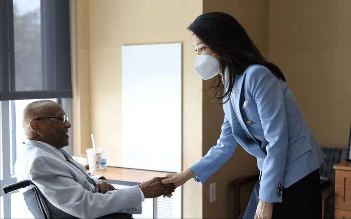 晚上金建希接见了参加朝鲜战争的美国老兵时,场合更为严肃。此时的金建希下身换成黑色半裙,通过颜色的变换,也体现出不同场合的需求。