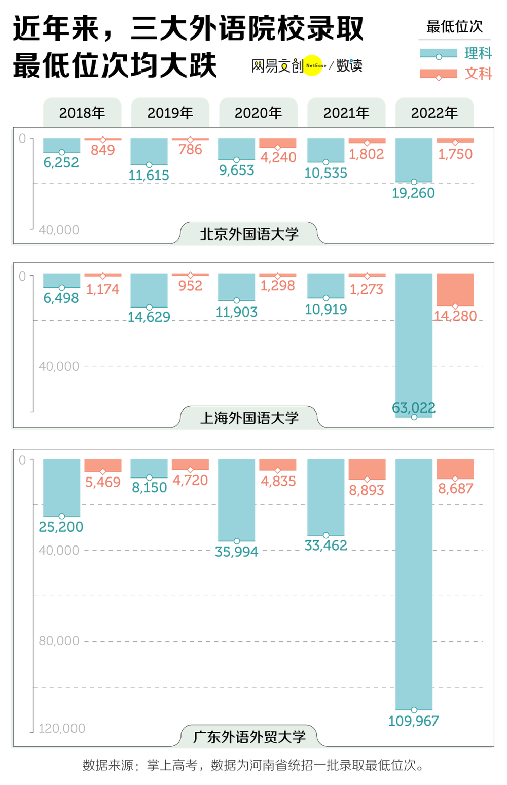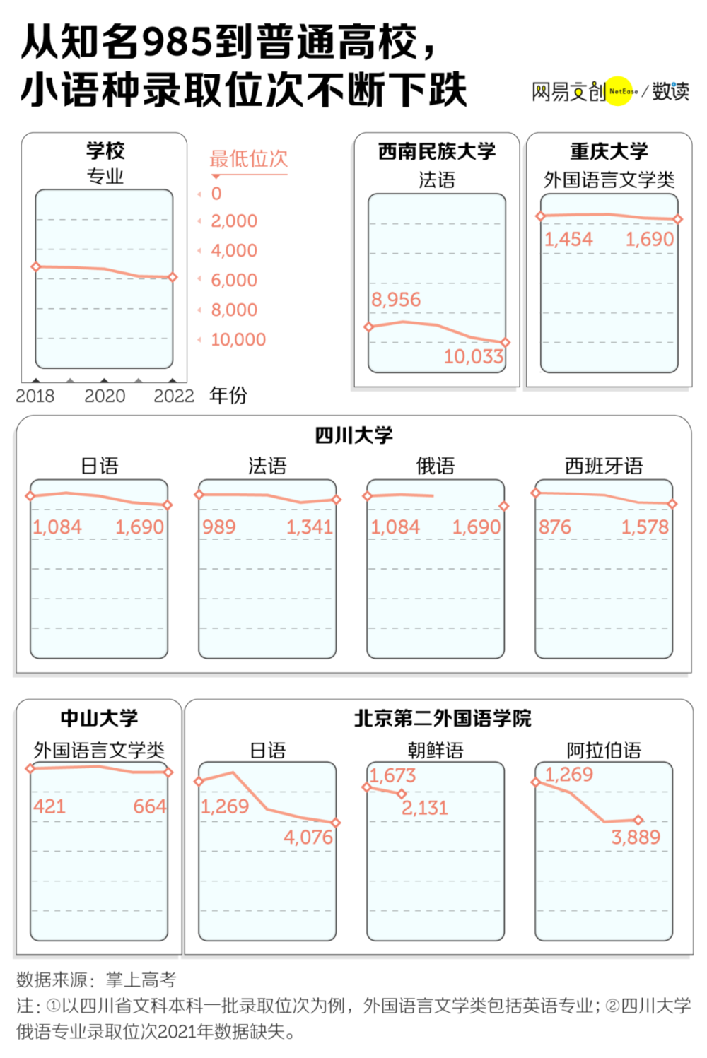 在高校招生领域内,大家习惯性将除英语外的外语类专业统称为“小语种”。阳光高考信息平台数据显示,全国现有 509 所本科院校开设日语专业,171 所开设俄语专业,151 所开设法语专业,118 所开设德语专业,100 所开设西班牙语专业。集齐上述小语种专业的外语院校,却在近年来失去高考生的青睐。头部外语院校的分数线,这几年开始肉眼可见地下降。例如在高考大省河南省,三大外语类院校去年都惨遭滑铁卢。2022 年,上外在河南理科最低录取位次掉落 5 万多名,广外理科暴跌近 7 万多名。之前拿着能去 985 的分数进入外语院校的网友们直言自己是大冤种,“人生一大投资失败”,和“买房碰上泡沫破裂的人”共情了。小语种专业也难以支棱起来。2020 年和 2021 年,上外德语专业在吉林省招收的理科本科一批最低位次尚处于 2547 和 2265 名,而 2022 年陡然下跌至 6303 名。遇冷的不止专业性强的外语类院校,从知名 985 院校到普通大学,小语种专业的录取位次也在近几年持续走低,甚至成为一些高校录取分数线最低专业和调剂专业 [1]。小语种祖上并不是没有阔过,上世纪 90 年代,迎来了全球化的开端,外企大量进入中国,外语人才极为抢手。英语、小语种、国际贸易、国际关系,稍微与“国际”沾点边的专业,都成了香饽饽 [2]。吃到时代红利的外语院校分数线水涨船高。当年的外语院校高分学霸扎堆,外语专业毕业生也自带光环。十年前,“一带一路”倡议提出后,站在时代风口的小语种又变得炙手可热。2015 年起,全国高校掀起了一波增设小语种专业的浪潮 [3]。2017 年,北京外国语大学新增 11 个小语种专业,次年又新增 14 个小语种专业。据扬州网报道,2017 年江苏 35 所高校新增 101 个本科专业,其中小语种就占了五成 [4]。2018 年,各大高校小语种专业文理科投档线大幅增长。在中传,当年提前批小语种文科录取分数线比前一年高出 27 分 [5]。在豆瓣“大学后悔学小语种小组”里,三万七千多名小语种人在警告着后来人“不要靠近小语种,会变得不幸”。有人吐槽,学小语种意味着为了在短短几年时间内掌握一门陌生的语言,繁密的课程将成为一种常态,有些学校甚至在大四还安排了课程。小语种的就读体验让很多人直呼救命。很多学生吐槽读了高四,天天早七,考试毫无范围,学习永无止境。语言学习没有捷径可走,在课堂之外他们还需要投入大量时间去背单词、练口语、磨听力、阅读书籍。然而,一些学校的教学已经和时代脱轨。有人发现选用的教材内容还停留在二十年前——学了两年俄语发现自己“冰箱”都不会说,但是会说“伊卡鲁斯牌汽车”“康拜因联合收割机”“拿电烙铁”、“改善保险装置”。新编日语,真的超级落后。很多短语我讲出来连日本人都一愣的那种程度……语言更新换代很快的,我们学了太多永远用不上的词汇。但人家生活中的常用词,可能我们考了专八都还不会。近几年来紧张的国际形势也对出国留学产生了影响。失去了去国外磨练语言的机会,一些学生选择在国内升学。虽然高考分数在下滑,但小语种的考研分数线却越来越卷。小语种的硕士点并不多,除了 985 院校和北外上外,很多都是双非院校,以阿拉伯语为例,研招网数据显示仅有 13 所高校开设全日制硕士点。许多小语种考研人决心逃离本专业。但是,不学高数和弱化英语的培养特点,使得他们跨专业的难度直线上升。即便如此,一份超过 500 人次填写的小语种毕业去向表的数据显示,在读研的小语种学生中,半数以上选择了其他专业。苦学多载,小语种大学生的含金量还是不可避免地被稀释。有人感慨,别人报班两年或出国留学就能轻松超过四年来大学的语言水平。《2020 年语言学习趋势报告》指出,某在线教育平台上已超 1500 万中国用户,23% 和 14% 的用户在学习韩语和日语,意大利语、法语比英语更受追捧,小语种不再是大学生的专属 [6]。小语种培训机构也从 2013 年开始猛增。根据黑板洞察的统计,截至 2021 年 2 月,主营小语种培训业务的教育机构有 125 家,综合小语种教育机构共 41 家,日语教育机构数量高达 40 家 [7]。2018 年秋天,高中外语在原有的英语、日语、俄语基础上,新增德语、法语和西班牙语。此后越来越多高考生将小语种作为高考外语。据《南方周末》报道,2022 年高考报考日语的人数突破 25 万,全国高中日语学习者人数已接近 70 万 [8]。语言人才日渐饱和的今天,学这一行还有光明的未来吗?以某外国语大学法语专业的介绍为例,法语专业的出路主要有——国内工作:可以从事国家事业单位、高校、外事、外贸、外企、国企,合资企业,中小民营企业,旅游等部门,从事口笔译、经贸、商务及跨文化交流等方面的工作。国外工作:目前中国在非的企业众多,需要大量的法语翻译人才,法语专业的学生可以从事驻外企业的翻译、管理等工作。看似前景光明,但毕业生们就业时却迎来了当头一棒——小语种的高薪都是外派非洲拉美拿青春换来的,留在国内,就业只有北上广深,平均下来当然“高薪”。据 BOSS 直聘 2022 年调查显示,目前小语种就业岗位主要分布在运营客服、教育培训与销售这三大类门槛不高的行业。除了就业面狭窄外,小语种毕业生的薪资情况也并不乐观。根据麦可思的数据,包括英语专业在内的 2016 级外国语言文学类本科毕业生,五年后平均月收入为 8976 元,低于全国