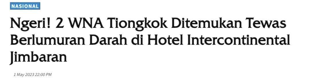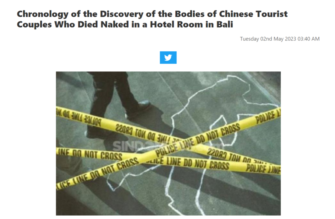 图片来源于indonesia,版权属于原作者当地警方称,由于2名死者没有遗失任何物品,所以目前仍然无法确定这起命案究竟是他杀还是自杀。但截至截稿前,根据对证人证词和一些线索进行了审查。警方强烈怀疑是自杀。”唉,2个拥有大好青春的生命就此戛然而止,真是令人唏嘘。希望警方能早日查出真相,而外出旅游的大家也多注意安全!本文由北美省钱快报小编整理,图片及信息来自radarbali,版权属于原作者。本文不代表本公众号立场,未经许可不得擅自转载,否则将追究责任。
