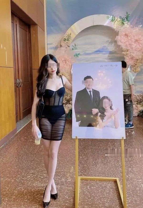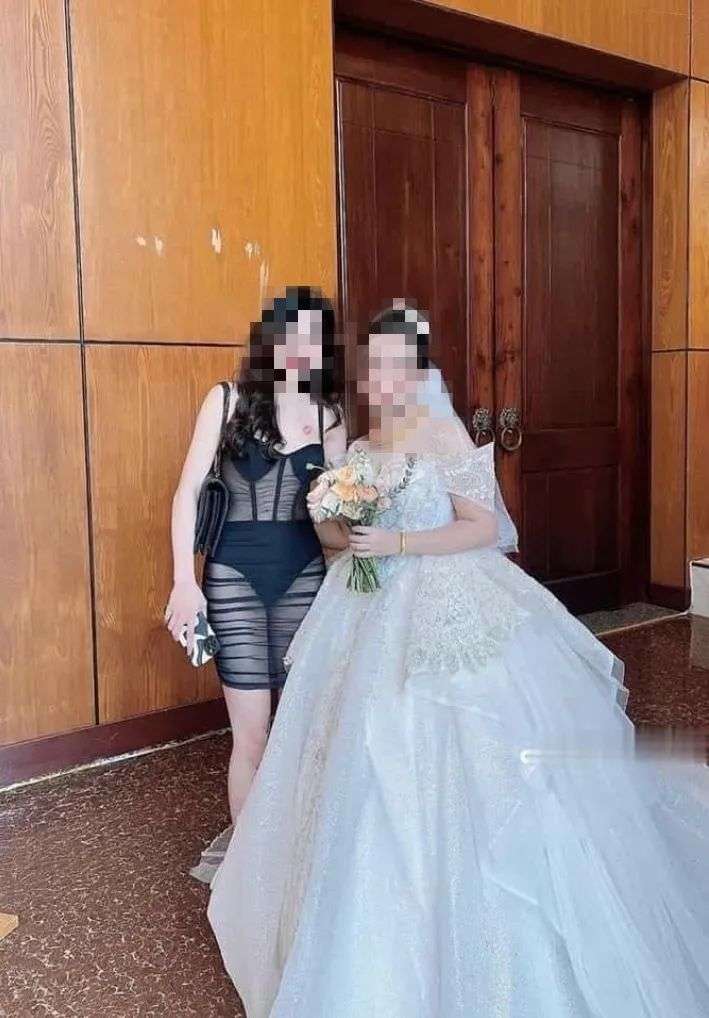 该女宾疑似是新娘的好友,当时她穿着透视装,大方在众人面前走来走去,为了纪念这个特别的日子,她还在接待处和新娘新郎的海报一起合了影。之后,她和穿着婚纱的新娘也亲密合照,新娘好像没有被朋友的穿着冒犯到,合照里笑得很灿烂。