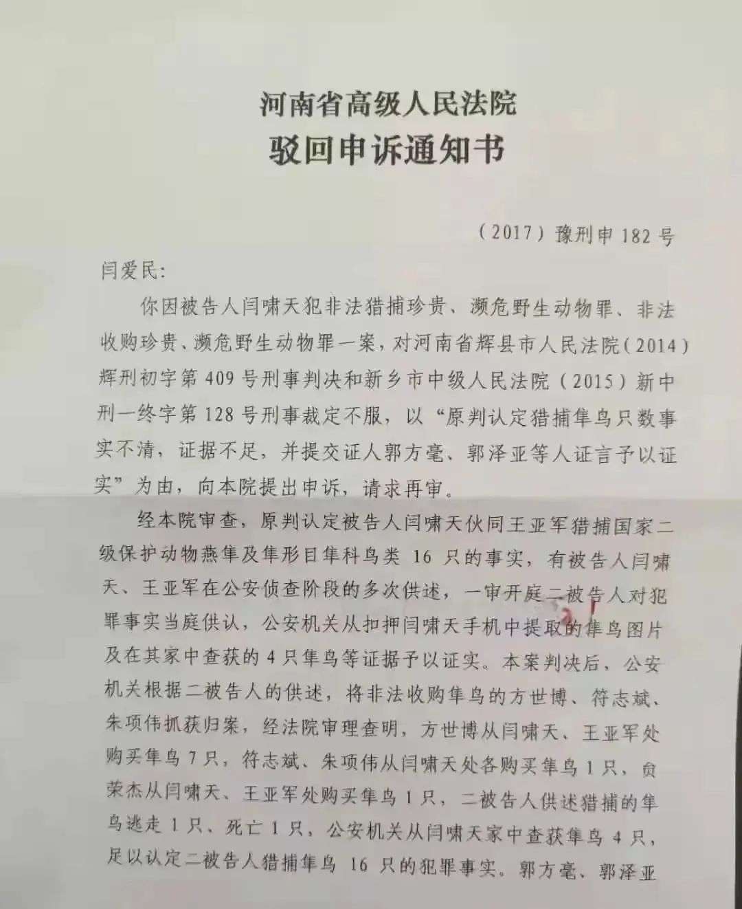 2014年11月28日,辉县检察院经过三次公开庭审,认定闫啸天和王亚军非法捕猎14只燕隼以及2只隼科动物,共计16只。