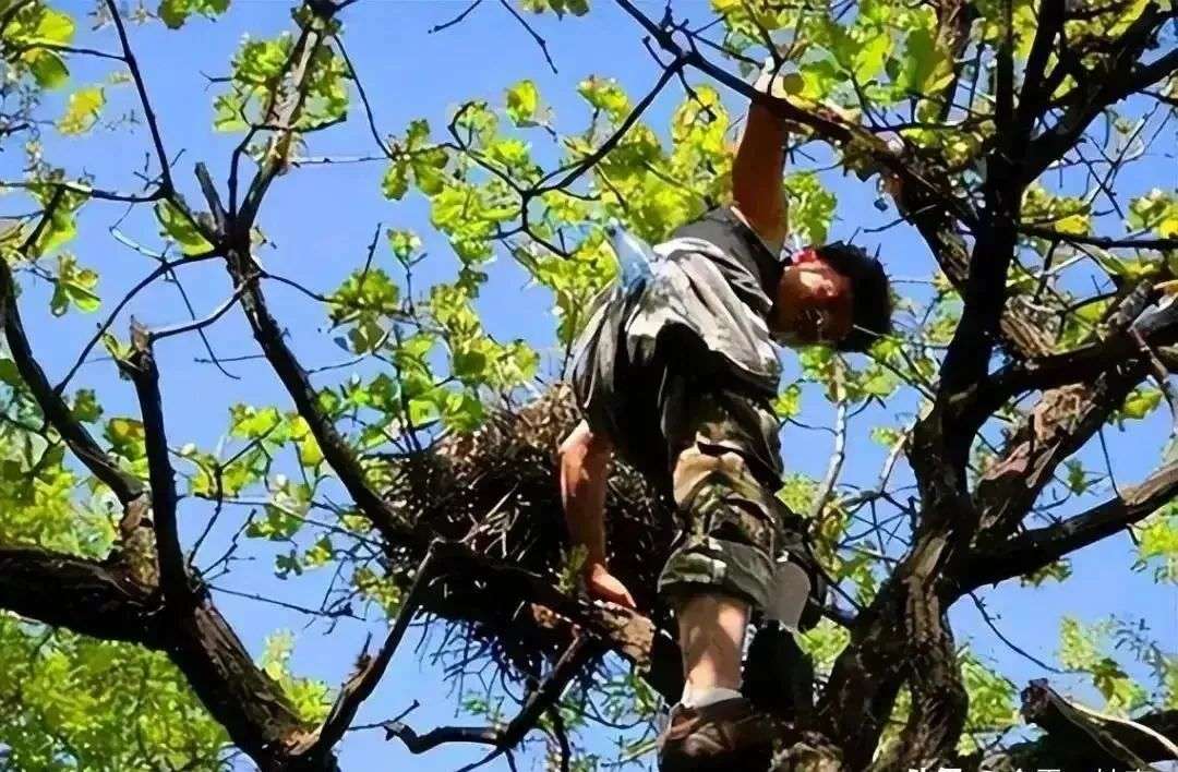 闫啸天和王亚军商量后,找来梯子爬到树上,掏了一窝小鸟。