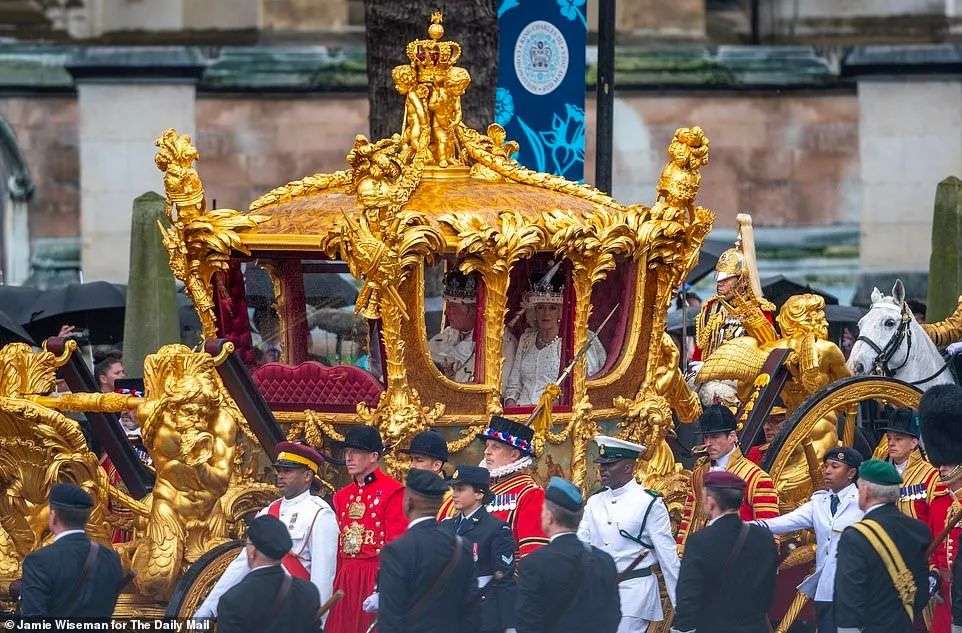 新国王与王后这次乘坐的是一辆相对现代化的马车、2014年首次启用的“钻禧”马车前往威斯敏斯特大教堂,这部马车上配有电动车窗和空调。