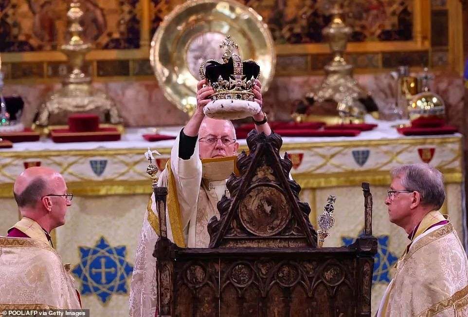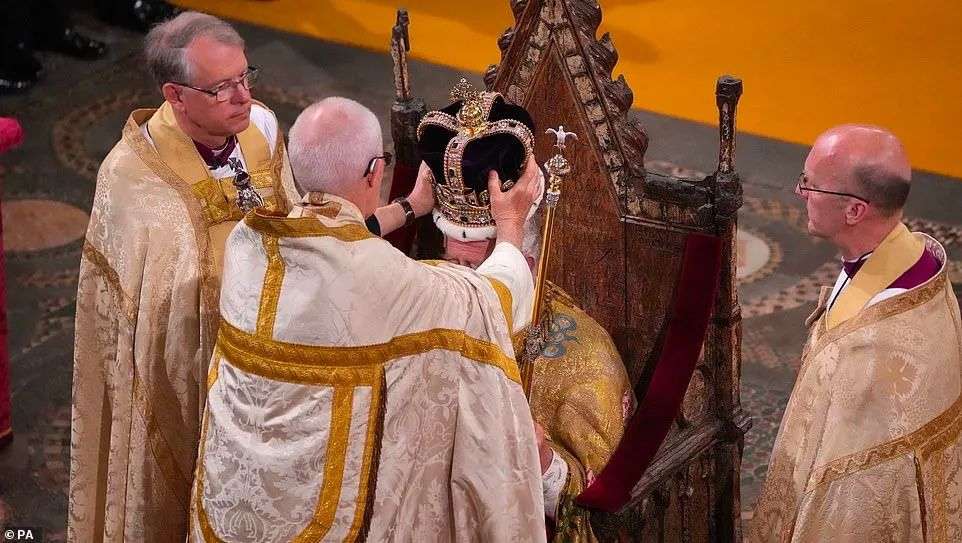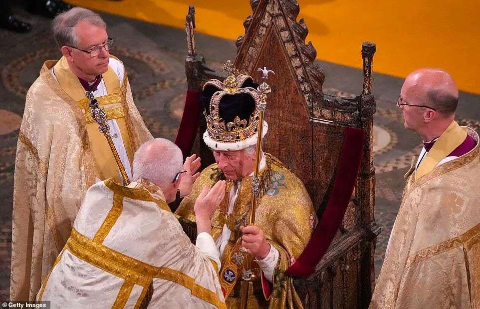 这是一项圣公会宗教仪式,由坎特伯雷大主教主持。仪式的高潮是大主教把圣爱德华王冠戴在查尔斯的头上——这顶纯金打造的王冠历史可追溯到 1661 年。