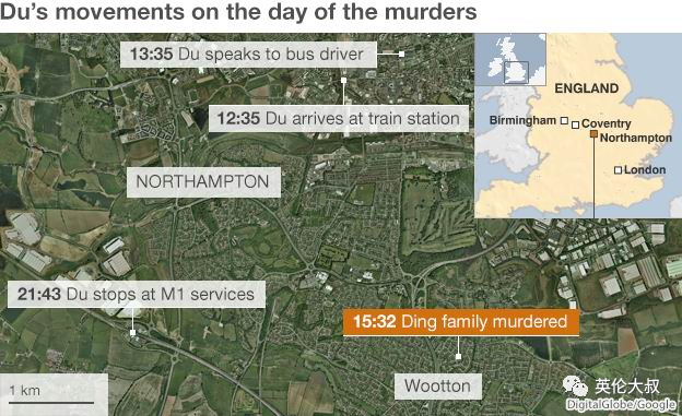 通过警方对CCTV监控的调取,识别到在丁家被屠门当晚的9点43分,杜安翔驾驶丁家租的车,在M1高速公路的15A交叉路口的服务区停下来,并在附近的商店买了一张北安普敦郡的地图。